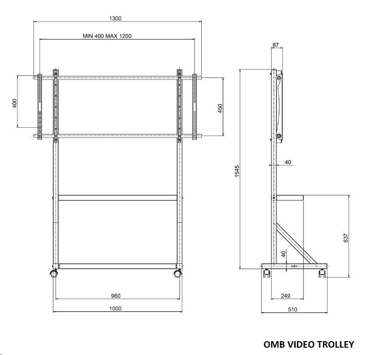 Profesionální vozík/stojan držák na televizory 55-100", pojezdová kolečka s brzdou, OMB VIDEO TROLLEY