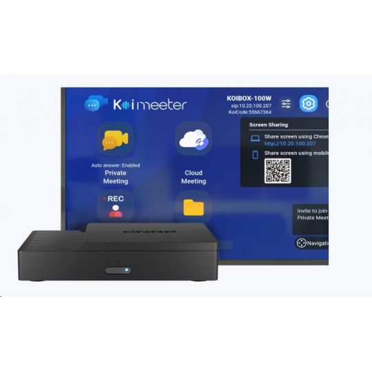 Zarízení KoiBox-100W s operačným systémom pre videokonferencie KoiMeeter je ideálnou náhradou nákladných konferenčných systémov založených na protokole SIP a ponúka pridanú hodnotu v podobe bezdrôtovej projekcie 4K, štvorpoločnej komunikácie a funkcií lokálneho úložiska. Pri súkromných stretnutiach pomocou zariadenia KoiBox-100W je zabezpečená vyššia bezpečnosť a súkromie v porovnaní so stretnutiami cez verejné cloudové služby a funkcia automatického prijímania poskytuje v určitých prostrediach väčšie pohodlie. Okrem súkromných stretnutí zefektívňuje zariadenie KoiBox-100W komunikáciu medzi rôznymi platformami tým, že umožňuje pripojenie k hovorom Zoom®, Skype™, Microsoft Teams®, Cisco Webex® a Google Meet™.