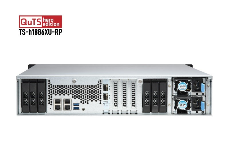 Zarízení TS-h1886XU-RP R2 2U s montážou do racku má dvanásť 3,5" diskových pozícií SATA 6Gb/s, šesť 2,5" slotov SATA 6Gb/s SSD, podporuje konektivitu 10GbE a štyri 2,5GbE a je vybavené štvorjadrovým procesorom Intel® Xeon® D-1622 s pamäťou až 128 GB DDR4 ECC (Error Correcting Code). S operačným systémom QuTS hero na báze ZFS dosahuje TS-h1886XU-RP R2 výkon serverovej triedy a vysokú spoľahlivosť. Či už ide o súborové servery s kritickým významom, virtualizačné servery, kolaboratívne úpravy videí alebo efektívne aplikácie na zálohovanie a obnovu dát, zariadenie TS-h1886XU-RP R2 s trojročnou zárukou ponúka vysoko výkonné a zároveň cenovo výhodné riešenie NAS.