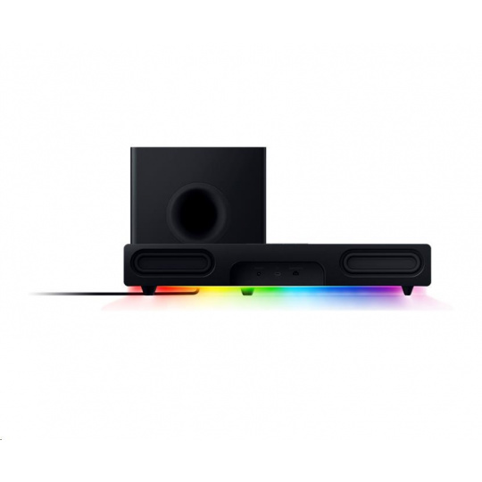 | OTHERS | Razer Chroma™ RGB (18 zones) THX Spatial Audio (PC based via Synapse 3) Bluetooth 5.2 (60ms low latency) USB audio input Razer Audio app Razer Chroma RGB app Custom 10-band EQ Raised feet on soundbar Headphone quick toggle Dimensions: Soundbar: 19.7 x 3.6 x 3.3" / 500 x 91.3 x 84 mm Subwoofer: 8.67 x 8.67 x 9.5" / 220 x 220 x 241.5 mm |