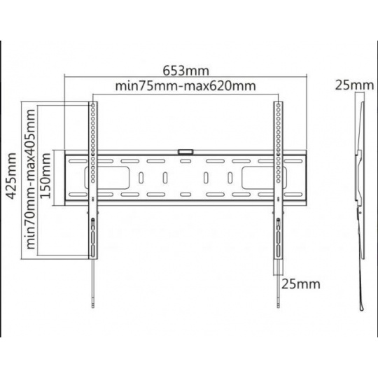Nástenný oceľový držiak na Plasma a LCD TV s uhlopriečkou 37"- 70" (94-178cm) a hmotnosťou maximálne 50kg. Konzola na zavesenie TV s vodováhou, nie je vertikálne výklopná, vzdialenosť od steny 25mm, materiál oceľ, cenovo dostupné, farba čierna. Uchytenie VESA: 200x200, 400x200, 300x300, 400x400, 600x400.