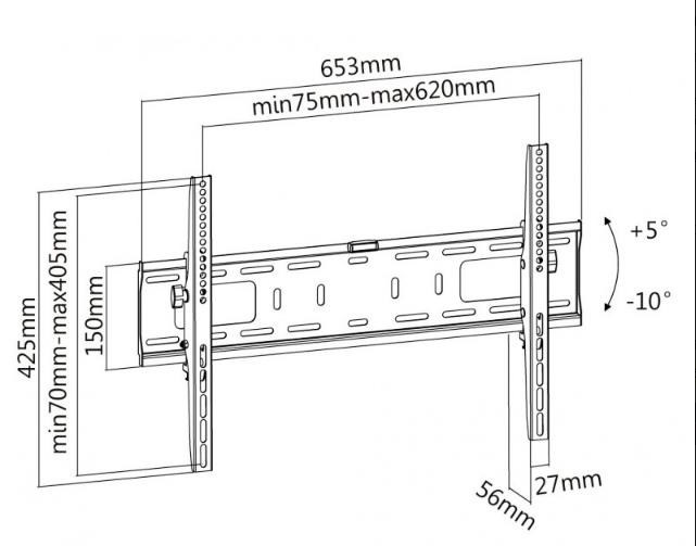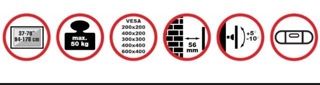 Nástenný oceľový držiak na Plasma a LCD TV s uhlopriečkou 37"- 70" (94-178cm) a hmotnosťou maximálne 50kg. Konzola na zavešenie TV s vodováhou, vertikálne výklopný +5°/-10°, vzdialenosť od steny 56mm, materiál oceľ, cenovo výhodné, farba čierna. Upevnenie VESA: 200x200, 400x200, 300x300, 400x400, 600x400.