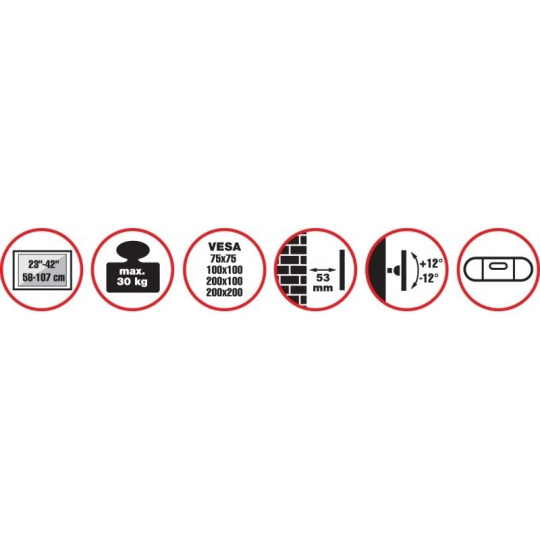 Nástenný oceľový držiak s minimálnou vzdialenosťou od steny na menšie LCD TV s uhlopriečkou 23"- 42" (58-106cm) a hmotnosťou maximálne 30kg. Konzola na zavešenie TV s upevnenými držiakmi, vertikálne výklopný +12°/-12°, vzdialenosť od steny 53mm, rozmery 243 x 225 x 53 mm, farba čierna. Uchytenie VESA: 100x100, 200x100, 200x200.