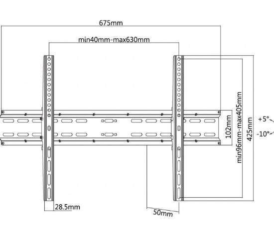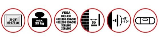 Nástenný oceľový držiak SLIM s minimálnou vzdialenosťou od steny na Plasma a LCD TV s uhlopriečkou 37"- 70" (94-178cm) a hmotnosťou maximálne 35kg. Stredová konzola na zavesenie TV s upevnenými držiakmi, vertikálne výklopný +5°/-10°, vzdialenosť od steny 50mm, materiál oceľ, farba čierna. Upevnenie VESA: 200x200, 300x200, 300x300, 400x200, 400x300, 400x400, 600x400.