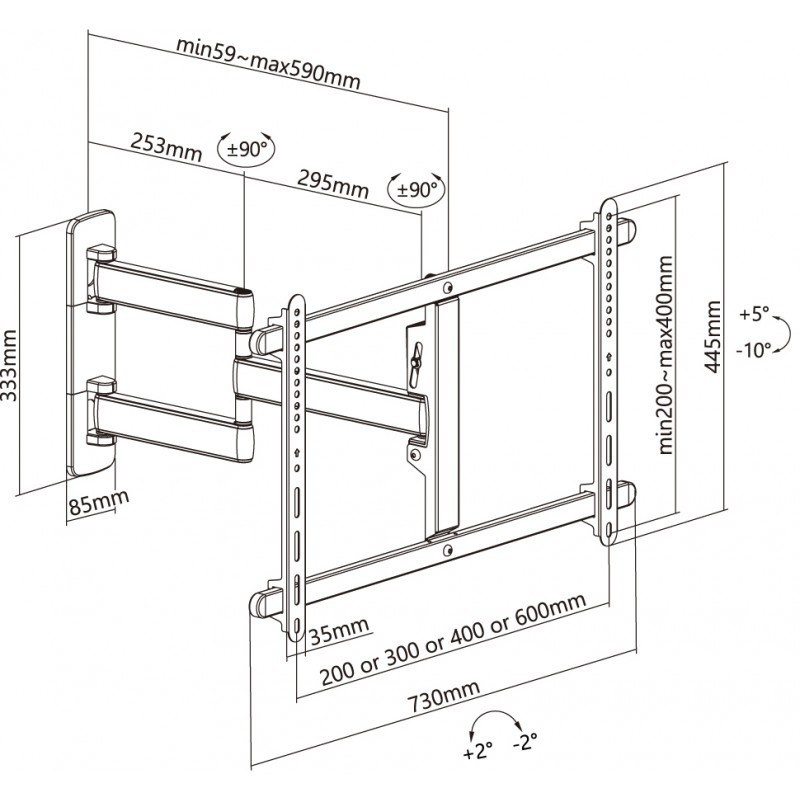 Nástenný oceľový držiak s bočným natáčaním na TV s uhlopriečkou 37"- 80" (109-203cm) a hmotnosťou maximálne 50kg. VESA max 600x400, 3x pant, vertikálne výklopný +5°/-10° a horizontálne otočný +90°/-90°, vzdialenosť od steny 59-590mm, Cable Managment, farba biela. Uchytenie VESA: 200x200, 300x200, 400x200, 300x300, 400x300, 400x400, 600x400. Direction indikátor, jemné nastavenie polohy oproti fixácii na stene +2°/-2°, rozmery 590 x 730 x 445 mm.