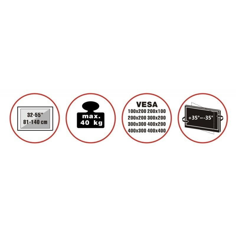 Televízny stojan na nábytok pre veľké TV s uhlopriečkou 32"- 55" (81-140cm) a hmotnosťou maximálne 40kg. Stredový nosný profil na sklenenej ploche, výška vrátane TV 142,5-152,5cm, držák vertikálne výklopný +0°/-35° a otočný +35°/-35°, rozmery 43x28x67cm, materiál sklo/oceľ, farba čierna. Uchytenie VESA: 100x200, 200x100, 200x200, 300x200, 300x300, 400x200, 400x400.