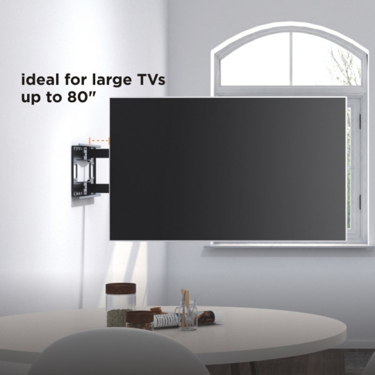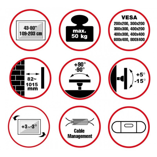 Nástenný oceľový XL držák s bočným natočením na LCD TV s uhlopriečkou 43"- 80" (109-203cm) a hmotnosťou maximálne 50kg. 3x pánt, vertikálne výklopný +5°/-15° a horizontálne otočný +90°/-90°, vzdialenosť od steny 82-1015mm, vodováha, Cable Managment, materiál oceľ, farba čierna. Uchytenie VESA: 200x200, 300x200, 400x200, 300x300, 400x300, 400x400, 600x400, 800x400.