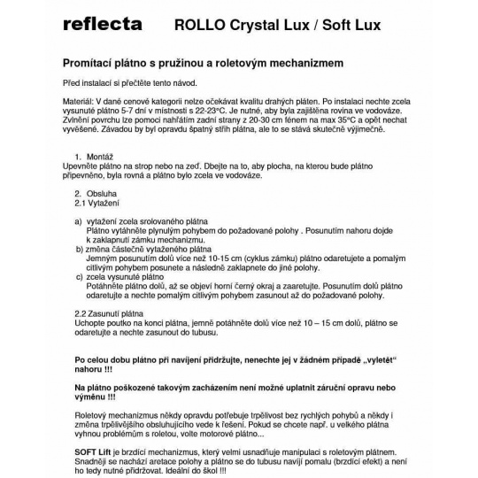 Roletové plátno SOFTLIFT CrystalLine 240x240cm s brzdou, viditeľná plocha 1:1, 131"/334cm, 236x236cm, biely hranatý kovový tubus 7x255cm/13kg, uchytenie na stenu/strop, materiál BetaLux - biela 0,35 tkanina 300g/m2 s 2cm čiernym okrajom a zadnou stranou, Gain=1,0, pozorovací uhol 120°. Lux - biely matný povrch pre maximálne verný a kontrastný obraz pri aspoň čiastočnom zatienení. PVC materiál s textilným základo vytvára rovinu bez vln, ale na okrajoch môže dochádzať k prehnutiu - postupne mizne. Jednoduché uchytenie 4 vrutmi na plastových stranách plátna - stena alebo strop. Možnosť aretácie polohy plátna pri každom otočení mechanizmu. SOFTLIFT mechanika bráni prudkému spätnému navíjaniu plátna a zároveň uľahčuje aretáciu v požadovanej polohe. Ideálne pre školy alebo miesta, kde hrozí nesprávna manipulácia s bežným ROLLO plátnom.