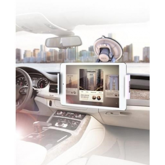 Držiak na čelné sklo pre 7-11" tablety v horizontálnej a vertikálnej polohe. Sklenený prísavný adaptér s guľovou hlavou na voľné nastavenie, otočný o 360°, obojstranné upevnenie, plast, biely...