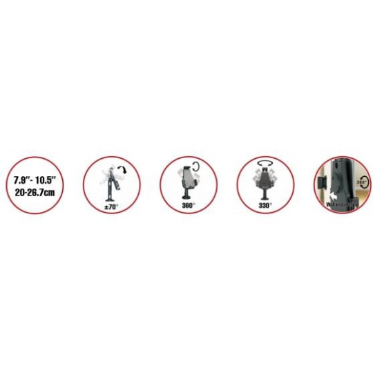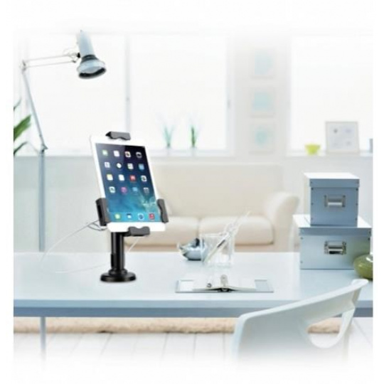 Bezpečnostné uchytenie pre 7,9-10,5" tablety na stôl a stenu. Nastaviteľný rozsah sklonu tabletu +70/-70° plus otočenie o 360°, skrutkové upevnenie na stôl - otočenie okolo osi o 330°, hmoždinky do steny, oceľové lanko proti krádeži, priechodka na kábel, čierna farba...