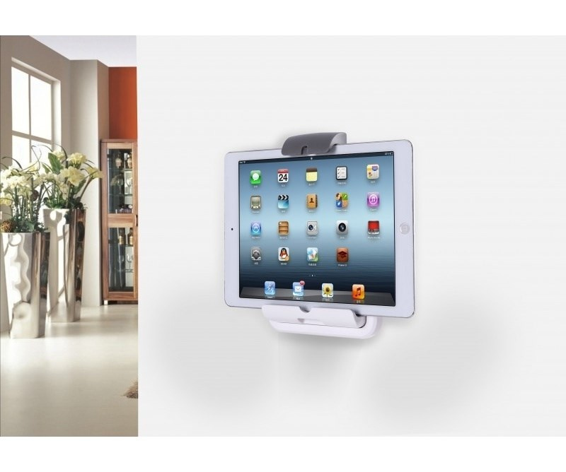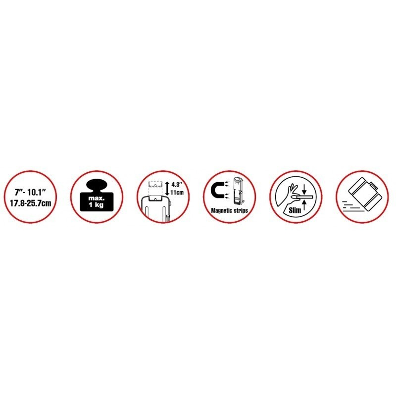 Tenký Slim stojánek pro tablety 7-10,1"/17-26cm max 1kg v horizontální i vertikální poloze na stůl, zeď a pomocí magnetů na kovovou plochu. VESA 75x75, 2x otvory pro uchycení vruty, fixace tabletu ze dvou stran, lehké plastové provedení pro transport, rozměry 19,7x14x3,6cm, šedý / bílý.