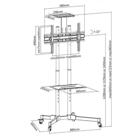 Televízny stolík na Plasma a LCD TV s uhlopriečkou 37"- 70" (94-178cm) a hmotnosťou maximálne 50kg. 2x stredová nosná tyč na kolieskach, držiak vertikálne výklopný +10°/-10°, horná výškovo nastaviteľná plocha pre kameru, polička, materiál oceľ, farba čierna. Uchytenie VESA: 200x200, 300x300, 400x200, 400x400, 600x400.