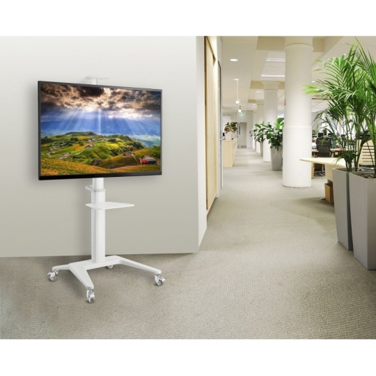 Televízny stolík na veľké LCD TV s uhlopriečkou 37"- 70" (94-178 cm) a hmotnosťou maximálne 50 kg. Stredový nosný profil 125-160 cm na kolieskach s aretáciou, držiak výklopný +5°/-12°, horná výškovo nastaviteľná otočná plocha pre kameru max. 5 kg, polička 34x46 cm max. 5 kg, Alu/ocel, farba biela. Uchytenie VESA: 200x200, 300x300, 400x200, 400x400, 600x400.