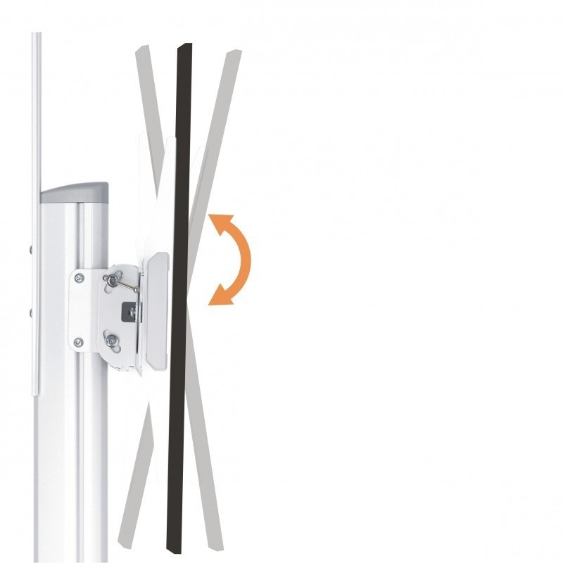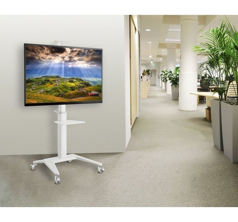 Televízny stolík na veľké LCD TV s uhlopriečkou 37"- 70" (94-178 cm) a hmotnosťou maximálne 50 kg. Stredový nosný profil 125-160 cm na kolieskach s aretáciou, držiak výklopný +5°/-12°, horná výškovo nastaviteľná otočná plocha pre kameru max. 5 kg, polička 34x46 cm max. 5 kg, Alu/ocel, farba biela. Uchytenie VESA: 200x200, 300x300, 400x200, 400x400, 600x400.