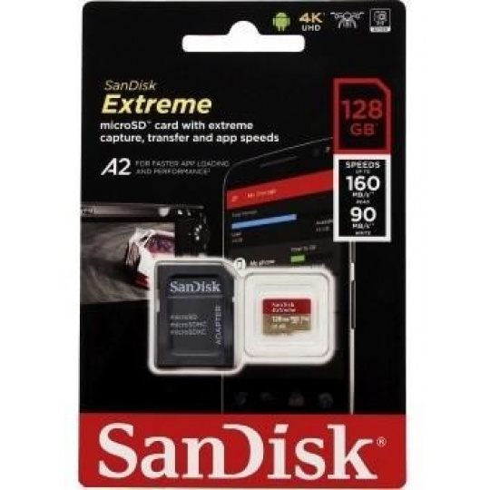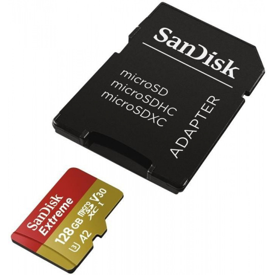 Karta SanDisk micro SDXC 128 GB Extreme Action Cams and Drones (190 MB/s Class 10, UHS-I U3 V30) + adaptér