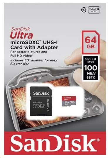 Karta SanDisk MicroSDXC 64 GB Ultra (100 MB/s, A1 Class 10 UHS-I, Android - zobrazovacie balenie) + adaptér