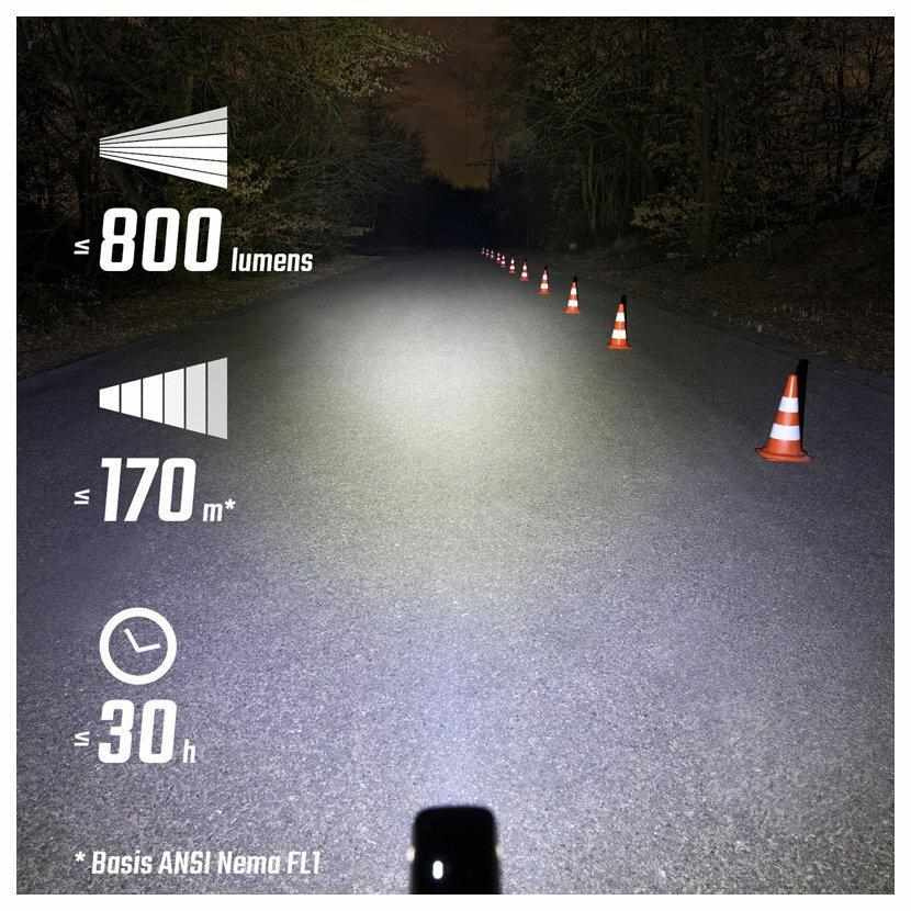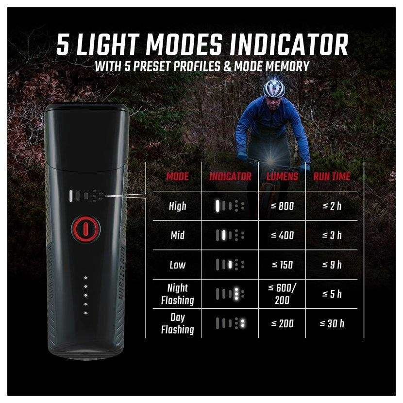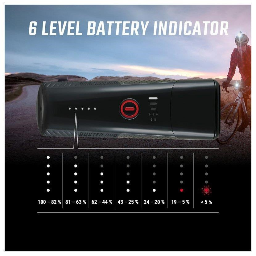 S svetlom Buster 800 s CREE LED uvidíte parádne aj v tme a nič vám nebráni v nočných dobrodružstvách. Svietivosť 800 lumenov a dosah 170 metrov sa postarajú o optimálne osvetlenie aj tých najsťažších ciest. Päť rôznych svetelných režimov ponúka flexibilitu pri kombinácii intenzity svetla a výdrže batérie. Indikátory LED na hornej strane svetla prehľadne zobrazujú, aký režim je momentálne vybraný a ako dlho ešte vydrží batéria. Môžete byť v závislosti od svetelného režimu na cestách až 30 hodín. Päť prednastavených režimových profilov sa postará o extra používateľský komfort.