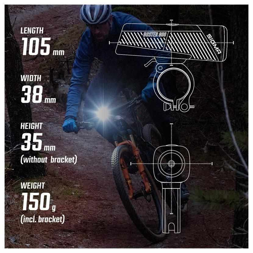 Buster 800 sa upevňuje na riadidlá pomocou skrutkového držiaku úplne bez nástrojov. Podľa potreby je možné svetlo horizontálne aj vertikálne vyrovnať a dokonale tak prispôsobiť aj na ohnuté riadidlá. Rýchlym uvoľnením rýchloupínáka môžete svetlo rýchlo odňať z riadidiel. Svetlo Buster 800 je možné z držiaka ľahko odňať a znova nasadiť. SIGMA držiak na riadidlá je vhodný pre riadidlá s priemerom 22–35 mm.
