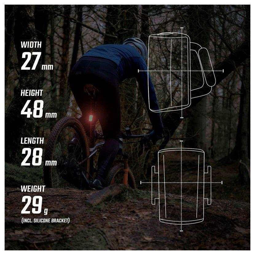 Svetlo sa zapína dvojitým stlačením. Veľké tlačidlo zapnutia je možné ľahko ovládať aj v rukaviciach. Týmto spôsobom sa zabezpečí, že zadné svetlo je možné bez problémov schovať do vrecka dresu alebo do batohu, aby sa náhodou nerozsvietilo.