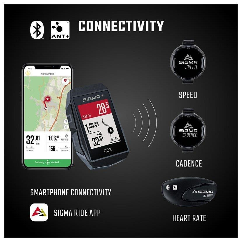 Na ROX 11.1 EVO sú už nainštalované štyri profily, ktorých však môže byť až 20. Môžete si vytvoriť vlastné športové profily a tak využiť svoj ROX 11.1 pre rôzne aktivity. Pomocou aplikácie SIGMA RIDE je možné individuálne konfigurovať a zvýrazňovať šesť rôznych tréningových obrazoviek až so šiestimi dátovými poliami. Tak budete mať dokonalý prehľad o svojich osobných cieľoch. Ďalšie obrazovky sú nainštalované prostredníctvom komoot pre tréning, trasu a navigáciu. Pre chytré trenažéry pripojené cez FE-C je možné načítať ďalšiu dátovú obrazovku. ROX 11.1 je možné prepojiť s chytrým telefónom a sledovať svoje výkony okamžite na Live Screen aplikácie SIGMA RIDE.