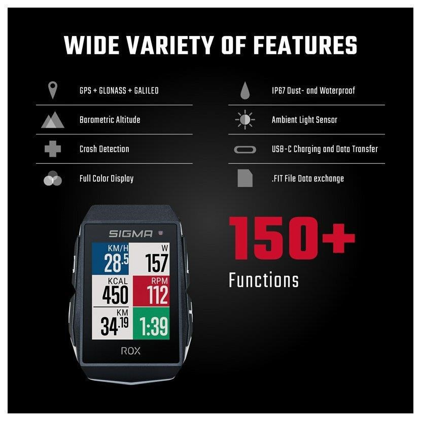 Nezáleží na tom, či sú pre vás dôležité super výkony alebo len udržiavať fyzičku či zdieľať svoje aktivity s priateľmi a rodinou. ROX 11.1 EVO s viac ako 150 funkciami sa stáva tréningovým parťákom pre tréningy vonku aj na trenažéri. Okrem množstva tréningových funkcií ponúka aj navigáciu, štruktúrované workouty a pripojenie k externým senzorom. Môžete sa tak úplne sústrediť len na svoj výkon, zvyšok za vás zariadi ROX 11.1 EVO. Vďaka funkcii LIVE SCREEN môžete svoje dáta sledovať a analyzovať kedykoľvek pomocou aplikácie SIGMA RIDE. S GPS navigáciou a množstvom ďalších funkcií posunie váš tréning na najvyššiu možnú úroveň. Prvotriedna integrovaná funkcia pre vašu bezpečnosť CRASH ALERT odošle správu vašim núdzovým kontaktom v prípade pádu. Chytré oznámenia Smart Notifications počas jazdy informujú o prichádzajúcich hovoroch a SMS.