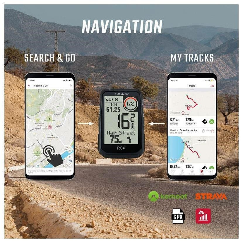 Počas navigácie sa na displeji ROX 4.0 Endurance zobrazí trasa a pokyny pre odbočenie "Turn-by-Turn". Odbočovacia šípka a akustický signál ukazujú ďalšie odbočenie. Aby ste odbočku nezameškali, zariadenie ROX počíta alebo načíta červený kruh pomocou farebných pruhov, ktoré ukazujú vzdialenosť do ďalšieho odbočenia. Tieto sa zmenšujú, čím ste bližšie k odbočke. ROX 4.0 Endurance tiež zobrazuje názvy ulíc. Ak sa spontánne odchýlite od navrhnutej trasy, zariadenie ROX v spolupráci so SIGMA RIDE rýchlo naplánuje novú trasu do cieľa s odpovedajúcim aktualizovaným profilom výšky.