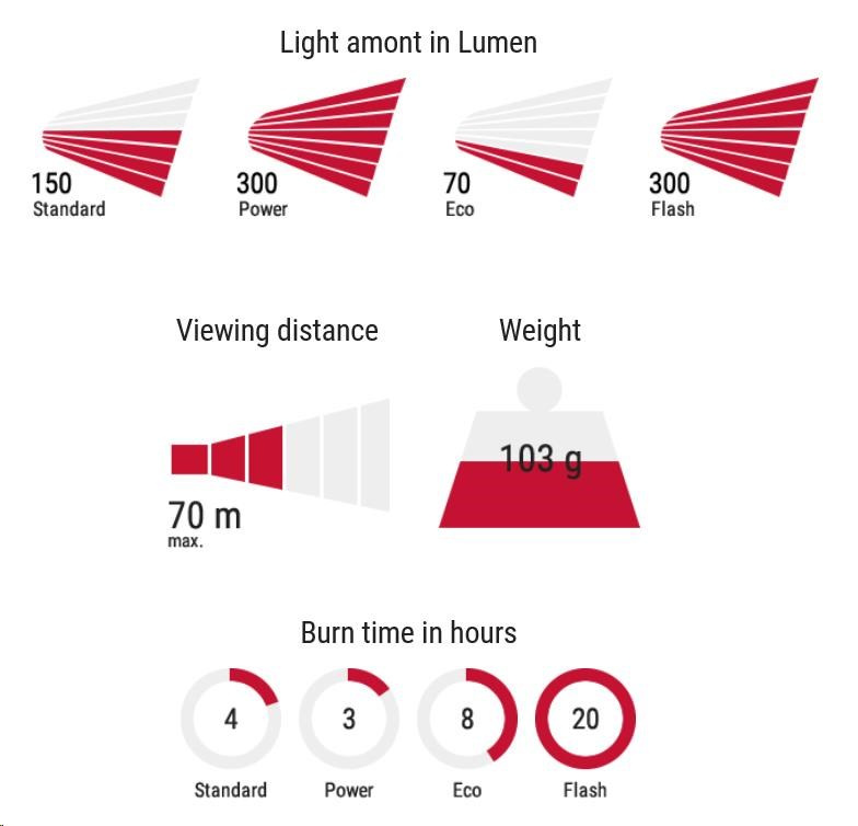 So štyrmi rôznymi režimami môže byť intenzita osvetlenia optimálne prispôsobená. Svetlo má 3 režimy svietenia: intenzívny 300 lm / štandardný 150 lm / ekonomický 70 lm a blikajúci režim.