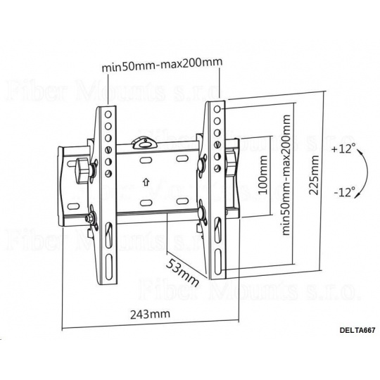 Sklopný držiak TV Fiber Mounts DELTA667 Kvalitný nakloniteľný držiak na televízory s uhlopriečkou 23" až 42" Televízny držiak s náklonom veľmi pevnej a odolnej konštrukcie. Jednoduché naklonenie obrazovky do požadovaného uhla a zabezpečenie v pozícii. Zabezpečenie proti vysadeniu obrazovky z držiaka. Výborná kvalita za skvelú cenu. Držiak TV sklopný, odsadenie 53mm, náklon +12° až -12°, VESA štandard 75x75 až 200x200, nosnosť 30kg - Fiber Mounts DELTA667 Technické údaje: nosnosť 30kg podpora VESA štandardu 75x75 až 200x200 odporúčame na televízory a monitory s uhlopriečkou 23" až 42" vzdialenosť od steny 53mm náklon +12° až -12° zabezpečenie náklonu v požadovanom uhle zabezpečenie proti vysadeniu TV veľmi pevná a odolná konštrukcia integrovaná vodováha jednoduchá a rýchla montáž súčasťou balenia montážny materiál farba čierna záruka 5 rokov Držiak DELTA667 podporuje VESA štandardy: VESA 50x50 VESA 75x75 VESA 100x100 VESA 200x100 a 100x200 VESA 200x200