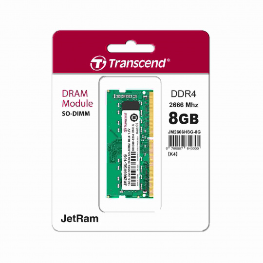 Pamäťové moduly JetRam spoločnosti Transcend sa vyrábajú s pravými značkovými čipmi DRAM triedy ETT, ktoré prešli prísnym procesom kontroly spoločnosti Transcend a prísnym environmentálnym testovaním. Moduly poskytujú vynikajúcu kompatibilitu a plne testovanú spoľahlivosť, ktorá je ideálna na modernizáciu počítača za atraktívnu cenu. Každý pamäťový modul má frekvenciu 2666 MHz, čo výrazne zvyšuje účinnosť prenosu dát vďaka vyššej šírke pásma až do 21 GB/s. Pracuje pri menovitom napätí len 1.2 V, pamäť DDR4 SO-DIMM JetRam od spoločnosti Transcend zabezpečuje zníženie prevádzkovej teploty aj elektrického zaťaženia pamäťového radiča s cieľom ušetriť až 40 % energie v porovnaní so štandardnými modulmi DDR3, ktoré ponúkajú 1.5V.