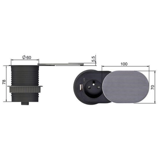 Inštalácia je jednoduchá a vyžaduje otvor s priemerom 60 mm. Pod pracovnou doskou má zásuvka hĺbku iba 76 mm, takže nezaberá veľa miesta. Pripojenie je zabezpečené pomocou 2m PVC kábla s uhlovou vidlicou. Tento kompaktný a funkčný doplnok prináša pohodlie a moderné technológie priamo na váš pracovný stôl, či už doma, alebo v kancelárii.
