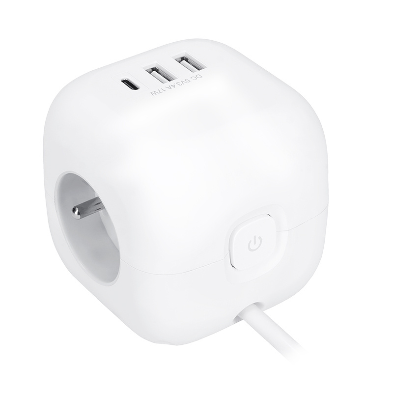 Predlžovací prívod v tvare kocky s dĺžkou strany 8 cm spája tri uzemnené zásuvky s detskou poistkou a USB nabíjačku s portami USB-C a USB-A. Vďaka 2m dlhému káblu poskytuje flexibilné využitie. Protisklzové podložky udržiavajú prívod stabilný na stole alebo pracovnej ploche. Podsvietený vypínač umožňuje jednoduché ovládanie všetkých zásuviek aj USB portov.