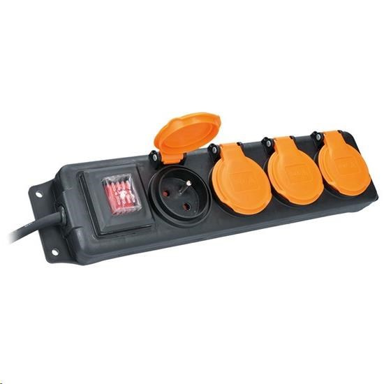 .Solight prodlužovací přívod IP44, 4 zásuvky, gumový kabel, vypínač, venkovní, ,5m