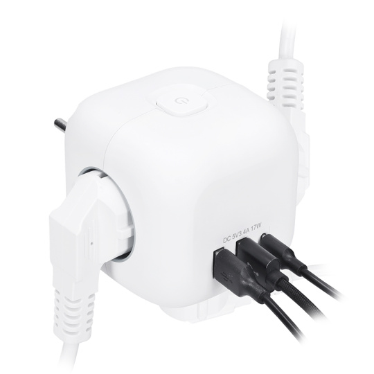 Kompaktný dizajn a jednoduché použitie Rozbočka v tvare kocky s dĺžkou strany 8 cm spája tri uzemnené zásuvky s detskou poistkou a USB nabíjačku s portmi USB-C a USB-A. Vďaka kompaktnému prevedeniu je ideálna na použitie v akomkoľvek interiéri. Podsvietený vypínač umožňuje jednoduché ovládanie všetkých zásuviek aj USB portov.