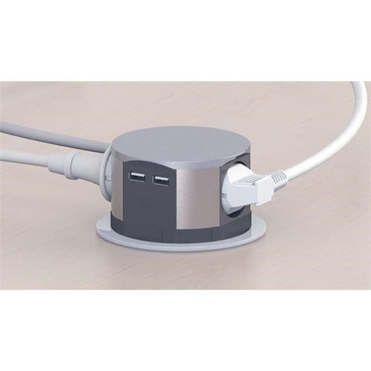 .Solight výsuvný blok zásuvek, 3 zásuvky, 2x USB, kruhový tvar nízký, prodlužovací přívod 1,5m, 3 x 1mm2, stříbrný