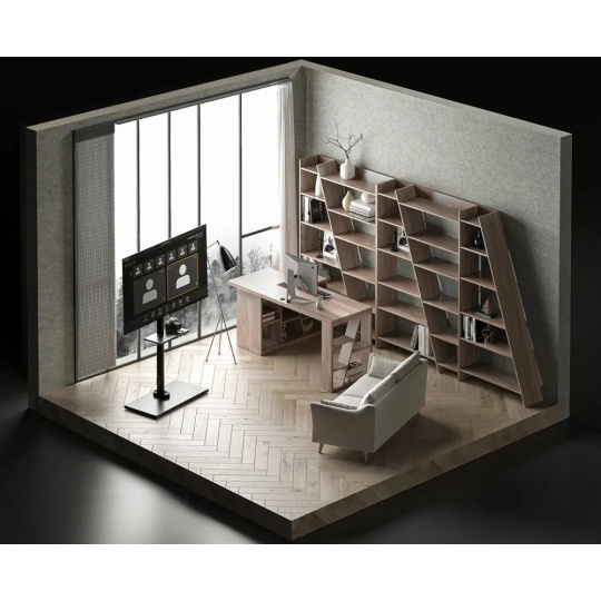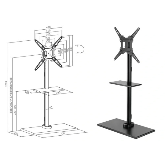 Podlahový stojan / stolík na TV i monitory 23" - 55", nastavenie výšky 868 / 908 / 948 / 988 / 1028 / 1068mm, náklon +6° / -6°, podstavec 700 x 350mm, polička 380 x 190mm s nastaviteľnou výškou 220 - 770mm, inštalačný materiál, vedenie káblov, VESA 100x100 až 400x400, nosnosť 35kg