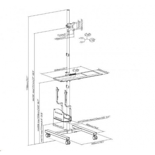 Pojazdný stojan na PC monitor a klávesnicu Fiber Mounts AX793 Profesionálne riešenie pre Vaše mobilné PC pracovisko - mobilný stojan na PC Potrebujete si vytvoriť pojazdné PC pracovisko za čo najlepšiu cenu? Máme pre Vás kompletné riešenie za bezkonkurenčnú cenu - pojazdný stojan s držiakom na PC, držiakom na monitor a policou na klávesnicu. Všetko je pritom ergonomické - nastaviteľná výška, náklon a natočenie monitoru, nastaviteľná výška klávesnice a myši, výškové nastavenie držiaku PC, pojazdové kolieska s aretáciou. Farebné prevedenie čierne, záruka 3 roky. Stojan na PC s držiakom monitoru a policou na klávesnicu a myš - mobilná pojazdná PC pracovňa - Fiber Mounts AX793 Technické údaje: držiak na PC s výškovým polohovaním, nosnosť 8kg polica na klávesnicu a myš s výškovým polohovaním, nosnosť 2kg držiak na monitor 17" až 32" s výškovým polohovaním, nosnosť 10kg držiak monitora podporuje VESA 75x75 a 100x100 / možnosť rozšírenia až na 200x200 otáčanie monitora do strán +/- 180° náklon monitora +/- 15° rotácia monitora +/- 180° celková nosnosť stojanu 20kg pojazdové kolieska s brzdou systém vedenia káblov výborná kvalita farebné prevedenie čierne záruka 3 roky Profesionálna PC pracovňa, pojazdná / mobilná - Fiber Mounts AX793 Stojan na PC, monitor a klávesnicu s myšou AX793 podporuje VESA štandardy pre uchytenie monitorov: VESA 75x75 VESA 100x100 v prípade potreby možnosť zakúpenia rozšírenia na VESA 200x100 v prípade potreby možnosť zakúpenia rozšírenia na VESA 200x200