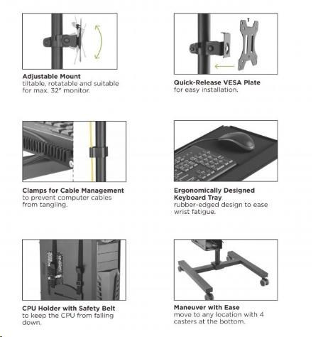 Pojazdný stojan na PC monitor a klávesnicu Fiber Mounts AX793 Profesionálne riešenie pre Vaše mobilné PC pracovisko - mobilný stojan na PC Potrebujete si vytvoriť pojazdné PC pracovisko za čo najlepšiu cenu? Máme pre Vás kompletné riešenie za bezkonkurenčnú cenu - pojazdný stojan s držiakom na PC, držiakom na monitor a policou na klávesnicu. Všetko je pritom ergonomické - nastaviteľná výška, náklon a natočenie monitoru, nastaviteľná výška klávesnice a myši, výškové nastavenie držiaku PC, pojazdové kolieska s aretáciou. Farebné prevedenie čierne, záruka 3 roky. Stojan na PC s držiakom monitoru a policou na klávesnicu a myš - mobilná pojazdná PC pracovňa - Fiber Mounts AX793 Technické údaje: držiak na PC s výškovým polohovaním, nosnosť 8kg polica na klávesnicu a myš s výškovým polohovaním, nosnosť 2kg držiak na monitor 17" až 32" s výškovým polohovaním, nosnosť 10kg držiak monitora podporuje VESA 75x75 a 100x100 / možnosť rozšírenia až na 200x200 otáčanie monitora do strán +/- 180° náklon monitora +/- 15° rotácia monitora +/- 180° celková nosnosť stojanu 20kg pojazdové kolieska s brzdou systém vedenia káblov výborná kvalita farebné prevedenie čierne záruka 3 roky Profesionálna PC pracovňa, pojazdná / mobilná - Fiber Mounts AX793 Stojan na PC, monitor a klávesnicu s myšou AX793 podporuje VESA štandardy pre uchytenie monitorov: VESA 75x75 VESA 100x100 v prípade potreby možnosť zakúpenia rozšírenia na VESA 200x100 v prípade potreby možnosť zakúpenia rozšírenia na VESA 200x200