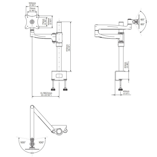 Profesionálny stolný držiak na monitor Edbak DM101 Profesionálny stolný držiak na monitory 17-27", výsuvný 0-700mm , otočný +/-360°, sklopný +/-60°, výškové polohovanie 100-400mm , pivot +/-360°, VESA 75x75 a 100x100, nosnosť 10kg Dizajnový profesionálny kancelársky držiak na monitor - najvyššia kvalita a krásny moderný dizajn. 3D polohovanie - otáčanie do strán, výškové polohovanie, naklápenie, funkcia pivot, nastavenie vzdialenosti od stolového uchytenia, systém vedenia káblov. VESA 75x75 a 100x100, nosnosť 10kg. Systém na vedenie káblov, farba čierna, záruka 5 rokov. Profesionálny kancelársky stolný držiak na monitor Edbak DM101 Technické údaje: nosnosť 10kg podpora VESA štandardov 75x75 a 100x100 odporúčaná uhlopriečka monitoru 17" až 27" otáčanie do strán +/-360° nastavenie vzdialenosti od stolového uchytenia max. 700mm veľký rozsah naklápenia +/-60° nastavenie výšky 100-400mm funkcia pivot +/- 360°- obrazovku je možné prekrútiť na šírku alebo na výšku systém pre vedenie káblov 2 typy stolových uchytov (svorky max. 120mm, priechodka max. 55mm) najvyššia kvalita, krásny dizajn farbené prevedenie čierne záruka 5 rokov detail držiaka monitora Edbak DM101Skryté vedenie káblov držiaka monitorov Edbak DM101 Stolný kancelársky držiak Edbak DM101 podporuje VESA štandardy: VESA 75x75 VESA 100x100 možnosť zakúpenia rozšírenia VESA 200x100 možnosť zakúpenia rozšírenia VESA 200x200