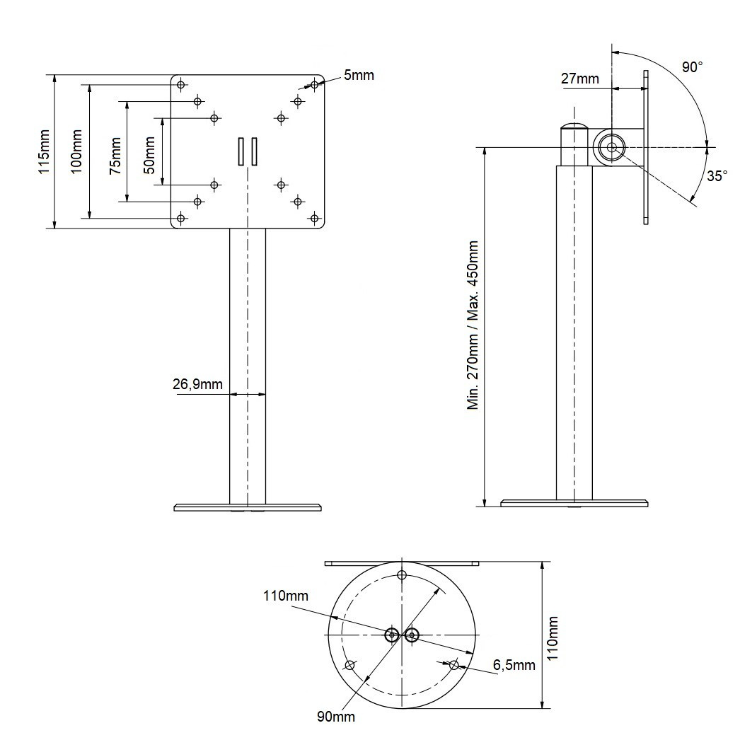 Stolný držiak na dotykové monitory EDBAK SV30 Držiak na TV a monitory 15-43", nastaviteľná výška 280-450mm, nastavenie náklonu -30°/+90°, otáčanie do strán +/-180°, 2 typy stolových uchýtov, VESA 75x75 a 100x100, nosnosť 10kg Stolný držiak pre monitory a televízie 15-43", ktorý vyniká svojou vynikajúcou kvalitou, nastaviteľnosťou a aretáciou obrazovky v nastavenej polohe. Nastaviteľná výška v rozmedzí 28-45cm od stolovej dosky, otočenie do strany +/- 180°, naklápanie v širokom rozsahu od -30° až do +90° (obrazovka vodorovne). Držiak je dodávaný so 2 typmi stolového uchytenia - svorka pre uchytenie na okraje stolov a hliníková skruž s otvormi na ukotvenie do stolovej dosky. Držiak podporuje VESA štandardy 75x75 a 100x100 a má nosnosť 10kg. Vďaka pevnej konštrukcii a aretácii polohy je držiak vhodný nielen na monitory a televízie, ale aj na dotykové obrazovky. Záruka 5 rokov. Stolný držiak na monitory EDBAK SV30 Technické údaje: nosnosť 10kg vhodný pre monitory, televízie a dotykové obrazovky 15" - 43" podporuje VESA štandardy 75x75 a 100x100 nastaviteľná výška 280 až 450mm otočný +/- 360° sklopný +90°/-30° voľba vhodného typu uchytenia na stolovú dosku - na okraj alebo do priestoru fixácia v požadovanej polohe ľahká inštalácia farebné vyhotovenie čierne záruka 5 rokov Stolné držiaky na monitory alebo televízie Edbak SV30 Držiak podporuje VESA štandardy na uchytenie monitorov: VESA 75x75 VESA 100x100 Na držiaky EDBAK SV30 je možné zavesiť všetky monitory a televízory, ktorých hmotnosť je maximálne 10kg a ktoré podporujú niektorý z vyššie uvedených VESA štandardov. Výška televízie alebo monitora (nie uhlopriečka) nesmie byť väčšia ako 36cm.