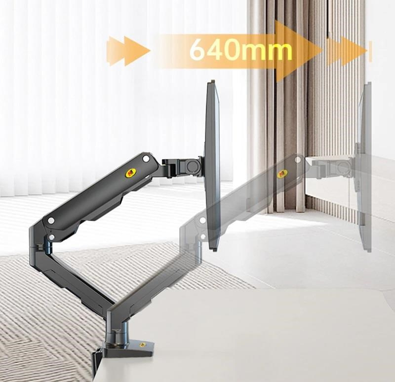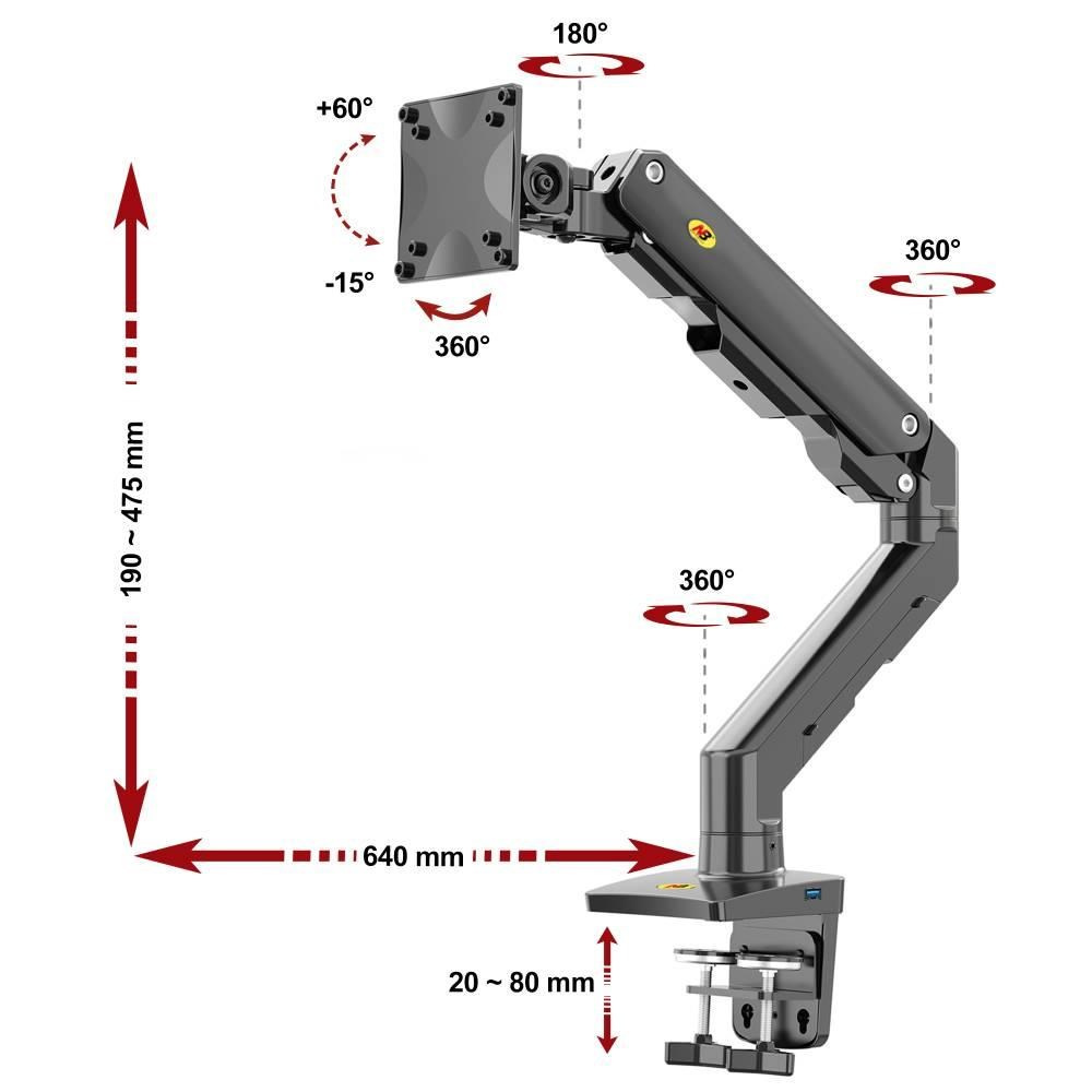 Držiak na monitor TV NB G50 Profesionálny stolový držiak na širokouhlý monitor alebo All in One PC 27-45", otočný +/-180°, sklopný +60°/-15°, nastaviteľná výška od stola 190-475mm, nastaviteľná vzdialenosť 0-640mm, 1x port USB, 2 typy stolových úchytov, systém vedenia káblov, VESA štandardy 75x75 a 100x100, nosnosť 16kg Jeden z najkvalitnejších stolových držiakov na zaveste širokouhlých monitorov alebo All in One PC - profesionálny, kvalitná konštrukcia, dizajn dôsledne spracovaný do detailu a veľmi jednoduché polohovanie. Držiak odporúčame aj náročným zákazníkom, do vytížených prevádzok, kancelárií alebo showroomov. Svoje uplatnenie nájde na každom stole. Držiak je ideálny na širokouhlé aj klasické monitory, All in One PC alebo televízory s uhlopriečkou 27-45", u širokouhlých monitorov môže byť uhlopriečka aj väčšia. Podmienkou je hmotnosť v rozmedzí 5-16kg, pri ľahších obrazovkách nebude možné výškové polohovanie. Držiak podporuje VESA 75x75 a 100x100, v prípade potreby ponúkame aj rozšírenie na 200x100, 100x200 a 200x200. Kompletná polohovateľnosť: otáčanie +/-180°, naklápanie +60°/-15°, jednoduché nastavenie výšky vďaka plynovému piestu od 195mm až do 475mm, nastavenie vzdialenosti od úchytu 0-640mm, funkcia pivot, port USB, dôsledné vedenie káblov, 2 typy stolových úchytov. Profesionálny stolový držiak na širokouhlé monitory a All in One PC NB G50 Technické údaje: minimálna hmotnosť monitoru alebo TV 5kg maximálna hmotnosť monitoru alebo TV 16kg podporuje VESA štandardy 75x75 a 100x100 odporúčaná uhlopriečka monitoru TV 27" až 45" ideálny na širokouhlé monitory, zobrazovacie zariadenia, All in One PC alebo televízory otáčanie do strán +/- 180° naklápanie +60° / -15° nastavenie výšky od stolovej dosky 195mm až 475mm výškové polohovanie 280mm nastavenie vzdialenosti od stolného uchytenia 0-640mm funkcia pivot - horizontálne alebo vertikálne otáčanie obrazovky 1x port USB na základni držiaka systém vedenia káblov 2 typy stolových úchytov (na okraj alebo cez otvor do priestoru) farebné prevedenie čierne záruka 5 rokov Profesionálny stolový držiak na širokouhlý monitor NB G50 Stolový držiak na širokouhlé monitory TV NB G50 podporuje VESA štandardy: VESA 75x75 VESA 100x100