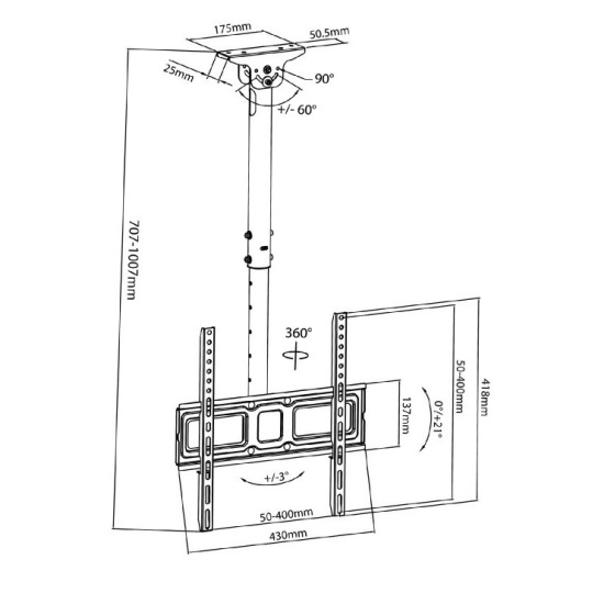 Stropný výsuvný držiak na TV Fiber Mounts M9C43 Stropný (stenný) držiak na TV 32-60", nastaviteľná dĺžka 717-1017mm, naklápanie 0-21°, VESA 75x75 až 400x400, nosnosť 35kg Kvalitný stropný držiak na televízie alebo monitory s uhlopriečkou 32-60". Držiak má nastaviteľnú dĺžku od 717mm do 1017mm, umožňuje otáčanie a naklápanie TV, upevnenie je možné na rovné aj šikmé stropy (alebo podkrovky), prípadne aj na stenu alebo bok stropného trámu - stropný úchyt je variabilný a umožňuje veľké uhlové polohovanie. Všetky káble môžete ľahko ukryť do tela držiaka. Podpora VESA 75*75 až 400*400, nosnosť 35kg. Materiál oceľ, dodávané vrátane montážneho materiálu. Kvalitný ale dostupný stropný držiak na TV 32-60" s nastaviteľnou dĺžkou, otáčateľný a sklopný Fiber Mounts M9C43 Technické údaje: - nosnosť 35kg - podpora VESA štandardov 75*75 až 400*400 - vhodný na televízie aj monitory s uhlopriečkou 32-60" - nastaviteľná dĺžka držiaka 717-1017mm - naklápanie 0° až 21° - korekcia roviny +/- 3° - otáčanie +/- 180° - uchytenie na rovné alebo šikmé stropy, na steny alebo zvislé povrchy - systém pre skryté vedenie káblov - materiál oceľ - montážny materiál - farebné prevedenie čierne - záruka 5 rokov Uhlovo polohovateľný úchyt stropného držiaka TV Fiber Mounts M9C43 Držiak podporuje VESA štandardy: - VESA 75*75 - VESA 100*100 - VESA 200*100 a 100*200 - VESA 200*200 - VESA 300*200 a 200*300 - VESA 300*300 - VESA 400*200 a 200*400 - VESA 400*300 a 300*400 - VESA 400*400