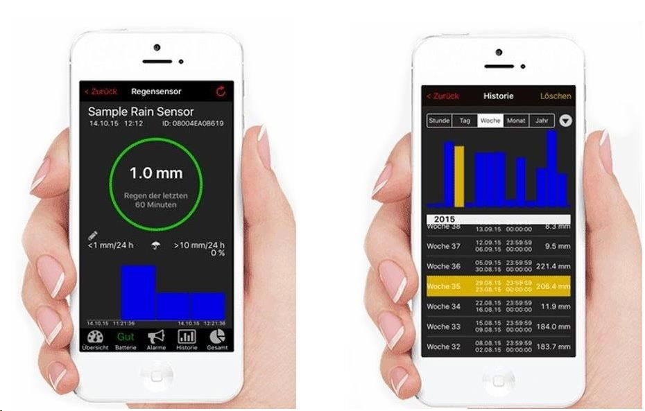 umožňuje pomocou mobilnej aplikácie okamžité sledovanie zrážok. Aplikácia Vás upozorní na prekročenie vopred nastavené hodnoty maximálnych zrážok pomocou správy na vašom mobilnom zariadení.