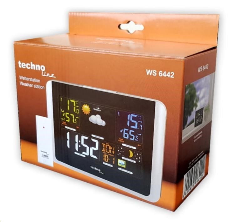 Meteorologická stanica s inverzným farebným LED displejom - farebný inverzný LED displej 127 x 79 mm, stále osvetlený pri napájaní sieťovým adaptérom, 2 stupne jasu, možnosť vypnutia, pri napájaní batériami možnosť osvetlenia displeja na 10 s - farby displeja: čas biela, dátum oranžová, vnútorná teplota a relatívna vlhkosť modrá, vonkajšia teplota a relatívna vlhkosť zelená - veľkosť číslic: čas 25,5 mm, skrátený názov dňa, dátum 10 mm, teplota 15,5 mm, rel. vlhkosť 11,5 mm - čas riadený rádiovým signálom DCF-77 - možnosť manuálneho nastavenia času - 12- alebo 24-hodinový formát zobrazenia času - možnosť nastavenia časovej zóny od -12 do +12 hodín - dátum, skratka názvu dňa (EN, FR, GE, SP, IT, NL, DK) - budík s funkciou opakovaného budenia (Snooze) po 10 minútach - budenie zvukovým signálom (10 sekúnd 1 pípnutie za sekundu, 10 sekúnd 2 pípnutia za sekundu, potom stále 4 pípnutia za sekundu) - 6 animovaných ikon predpovede počasia (jasno, polojasno, zamračené, dážď, búrky, snehové prehánky) - zobrazenie hodnôt vnútorné a vonkajšej teploty a relatívnej vlhkosti - možnosť zobrazenia teploty vo F alebo ve C - pamäť na max. a min. namerané hodnoty teploty a relatívnej vlhkosti (automaticky sa maže o 0:00) - šípky tendencie vývoja barometrického tlaku, vnútorné teploty a relatívnej vlhkosti - alarm horná a dolná hranica vonkajšej teploty na každom kanáli v rozsahu od -40 °C do +60 °C zvukovým signálom - alarm horná a dolná hranica vnútorné teploty v rozsahu od 0 °C do +50 °C zvukovým signálom - ikona nutnosti zatvorenia alebo otvorenia okna na základe nameraných vnútorných teplôt a relatívnej vlhkosti - možnosť zobrazenia vonkajšieho rosného bodu a teplotného indexu - fáza Mesiaca - možnosť pripojenia až 3 bezdrôtových senzorov mode- mode- TX960-TH, jeden bezdrôtový senzor je súčasťou balenia - možnosť automatického prepínania kanálov po 30 s - bezdrôtový prenos hodnôt vonkajšej teploty na frekvencii 433 MHz - dosah až 100 m v otvorenom priestore - indikácia slabých batérií - farba hlavnej jednotky čierna so strieborným rámikom - rozmery hlavnej časti 174 x 119 x 29 mm - napájanie sieťovým adaptérom alebo batériami - možnosť postavenia alebo zavesenia Bezdrôtové čidlo TX960-TH - vodeodolné prevedenie - dosah signálu bezdrôtového čidla až 100 m v otvorenom priestore - meranie teploty a relatívnej vlhkosti - indikácia vysielania LED diódou - možnosť postavenia a zavesenia - farba biela - rozmery 39 x 99 x 24 mm - napájanie 3 ks batérií 1,5 V typ AAA (mikrotužkové) Obsah balenia - hlavná jednotka WS 6442 - bezdrôtové čidlo TX960-TH - sieťový adaptér 5 V, 150 mA - návod CZ, EN, PL, GE, FR, ES, IT, NL