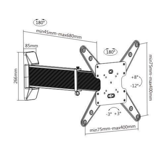 Teleskopický nástenný držiak na TV Fiber Mounts Telescopic Držiak unikátnej teleskopickej konštrukcie, výsuvný, otočný, sklopný, na TV 23-60", VESA štandardy 75x75 až 400x400, nosnosť 35kg Unikátny držiak na televízie, ktorý má špeciálnu teleskopickú konštrukciu. Jedno rameno pri vysúvaní vychádza z druhého. Držiak má nastaviteľnú vzdialenosť od steny od 45mm do 680mm, podporuje VESA štandardy 75x75 až 400x400 a je vhodný na uchytenie televízorov s hmotnosťou až 35kg. Televíziu môžete teda vysúvať od steny, otáčať do strán a nakláňať. Držiak je vhodný na stenu alebo do rohov miestností. Luxusná konštrukcia z hliníka v peknom čiernošedom prevedení. Záruka 3 roky. Unikátny držiak na TV 23-60" s teleskopickou konštrukciou, výsuvný, otočný, sklopný - Fiber Mounts Telescopic Technické údaje: maximálna zaťažiteľnosť 35 kg VESA štandard 75x75 až 400x400 vhodný na TV a monitory s uhlopriečkou 23-60" špeciálna teleskopická konštrukcia výsuvný od steny 45mm až 680mm otáčanie do strán +/- 90° naklápanie +8° až -12° korekcia roviny +/- 3° luxusné prevedenie, hliníková konštrukcia farba čiernošedá záruka 3 roky Držiak na LCD LED TV teleskop Fiber Mounts Telescopic Teleskopický držiak Fiber Mounts Telescopic podporuje VESA štandardy: VESA 75x75 VESA 100x100 VESA 200x100 VESA 200x200 VESA 300x300 VESA 400x200 VESA 400x400 Držiak Fiber Mounts Telescopic je vhodný na zavesenie všetkých televízorov, ktorých hmotnosť nie je vyššia ako 35kg a ktoré podporujú ktorýkoľvek z vyššie uvedených VESA štandardov. Velikost televízie nie je podstatná.