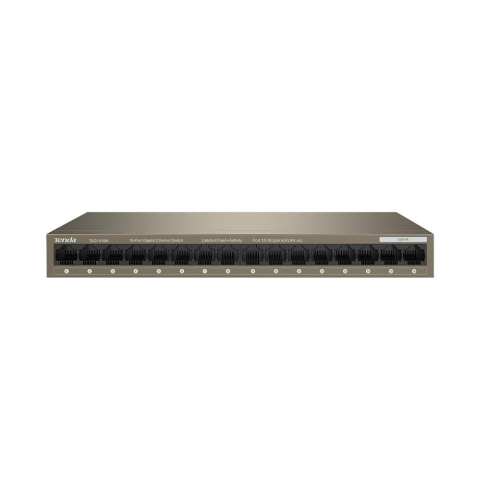 Gigabitový 16-portový switch TEG1016M výrobca Tenda Technology, plne podporuje štandardy IEEE 802.3, 802.3u, 802.3x, 802.3ab a je určený na použitie v firmách aj domácnostiach. Tenda TEG1016M prepája dáta v sieti pomocou 16 portov RJ45 s prenosovou rýchlosťou 10/100/1000 Mb/s a automatickou detekciou rýchlosti. Maximálna priepustnosť je 32 Gb/s. Auto MDI/MDIX na každom z portov. Prepojenie uzlov v režime Store-and-Forward. Full-duplex kontrola toku 802.3x. Navyše obsahuje tlačidlo pre zapnutie VLAN. Switch je napájaný externým zdrojom 12V DC, 1000mA. Maximálna spotreba 12 Wattov. Montáž na stenu, kovové prevedenie.
