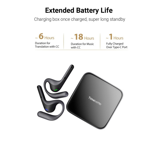 Praktické nabíjacie puzdro zabezpečuje, že budete mať slúchadlá vždy pripravené na použitie. Na jedno nabitie vydržia až 6 hodín nepretržitého tlmočenia, takže zvládnete aj dlhé rokovania bez prerušenia. Na počúvanie hudby ponúka až 12 hodín prehrávania.
