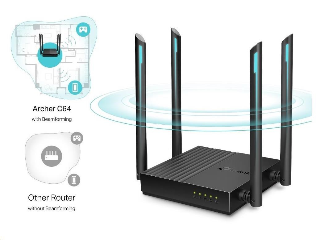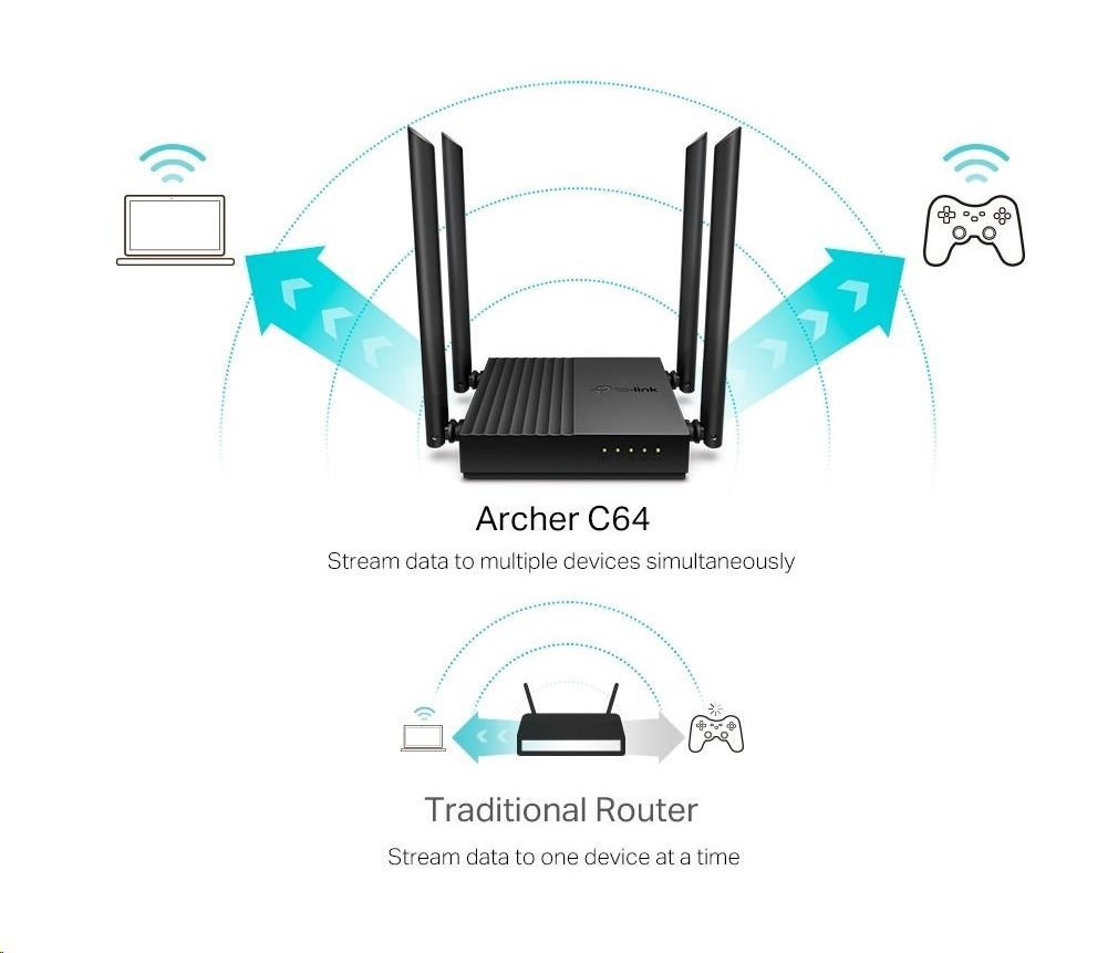 - Smerovač Archer C64 umožňuje pripojiť viac zariadení naraz a súbežne prenášať dáta vďaka podpore dvoch pásiem 2,4 GHz a 5 GHz. Pásmo 2,4 GHz poskytuje spoľahlivé pripojenie na odosielanie e-mailov, prehliadanie webových stránok a ďalšiu jednoduchú aktivitu. Pásmo 5 GHz ponúka rýchlosť až 867 Mb/s, čo je vhodné pre činnosti náročné na prenos dát, ako je napríklad streamovanie videa a hranie hier online.† Vďaka pripojeniu bez zadržania či zasekávania už nikdy o nič neprídete.