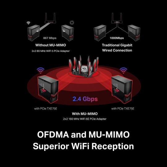 Archer TXE75E posunie príjem Wi-Fi signálu vášho počítača na novú úroveň, pretože revolučne využíva kombináciu technológií OFDMA a MU-MIMO. Wi-Fi pripojenie počítača vďaka tomu môže fungovať efektívnejšie, aleboť väčší počet zariadení môže komunikovať s routerom súčasne, bez čakania na prenos dát vo fronte.