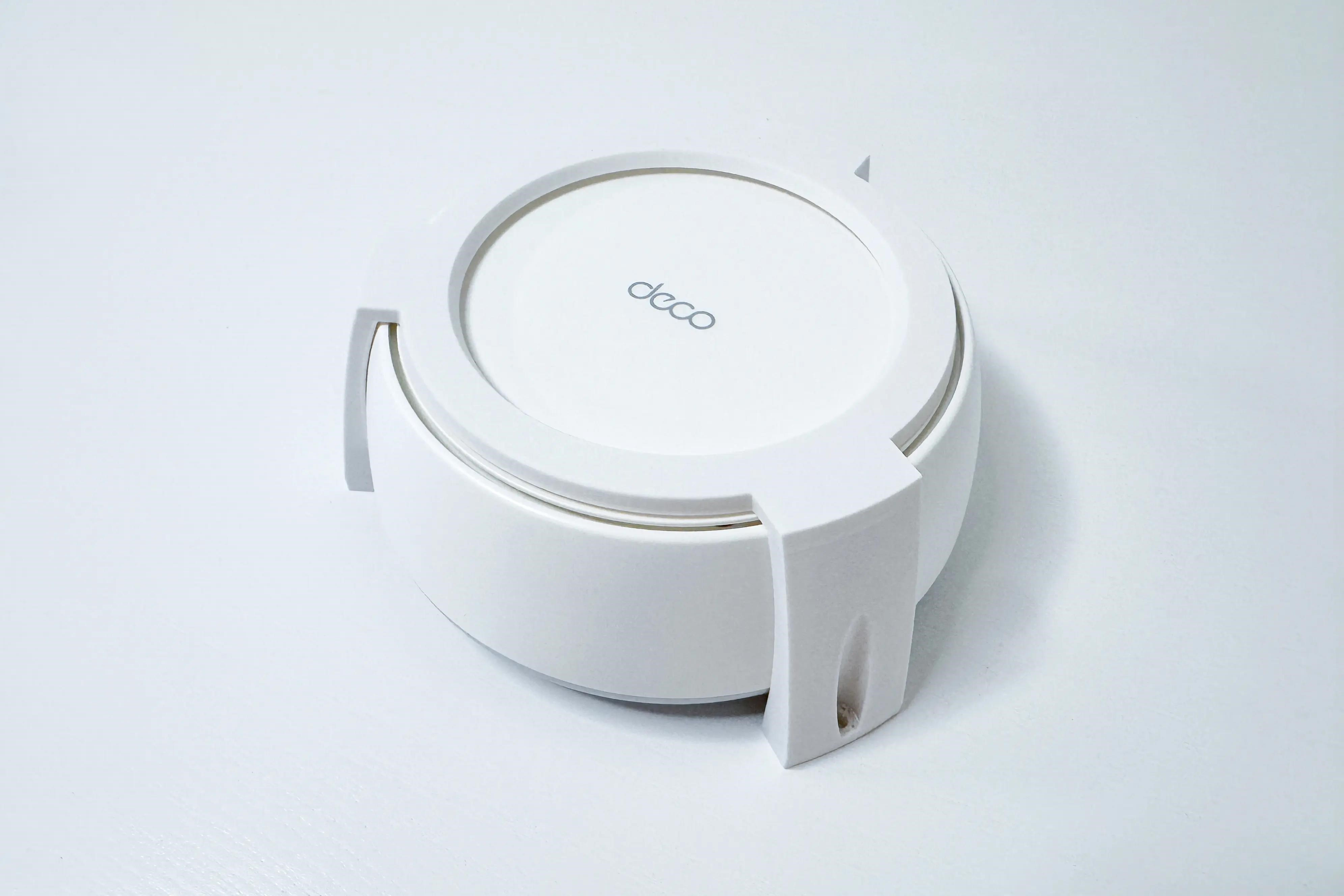 Plastový držiak na stenu a strop pre TP-Link DECO BE25 . Držiak je vyrobený z PETG materiálu na 3D tlačiarni a má bielu farbu.