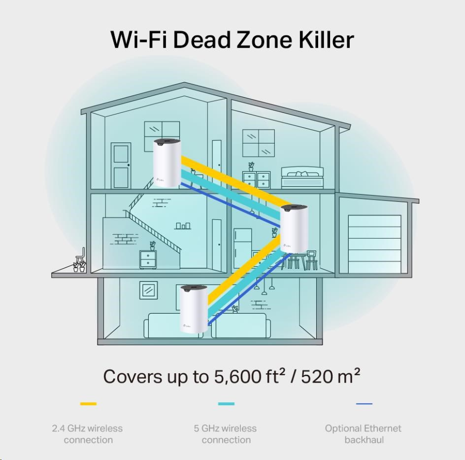 | WiFi Dosah | 3-5 izbové domy (3-pack) TP-Link Mesh technológia Voliteľný Ethernet backhaul spolupracuje, aby prepojil jednotky Deco a zabezpečil plynulé pokrytie 3× antény (vnútorné) Viaceré antény tvoria mriežku na zosilnenie signálu a pokrytie väčších oblastí Beamforming Sústreďuje bezdrôtový signál smerom ku klientom, čím rozširuje WiFi dosah |